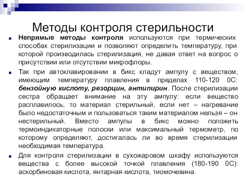 Так при автоклавировании в бикс кладут ампулу с веществом, имеющим температуру плавления в пределах 110-120 0С: бензойную кислоту, резорцин, антипирин. После стерилизации сестра обращает внимание на эту ампулу: если вещество расплавилось, то материал стерильный, если нет – нагревание было недостаточным и пользоваться таким материалом нельзя – он нестерильный. Вместо ампулы в бикс можно положить термоиндикаторные полоски или максимальный термометр, по которому определяют, достигалась ли во время стерилизации необходимая температура.