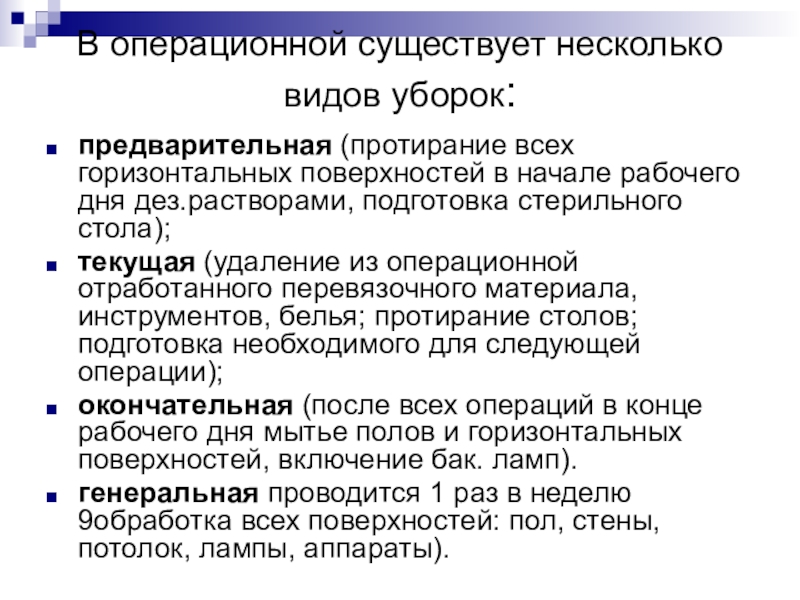 окончательная (после всех операций в конце рабочего дня мытье полов и горизонтальных поверхностей, включение бак. ламп).