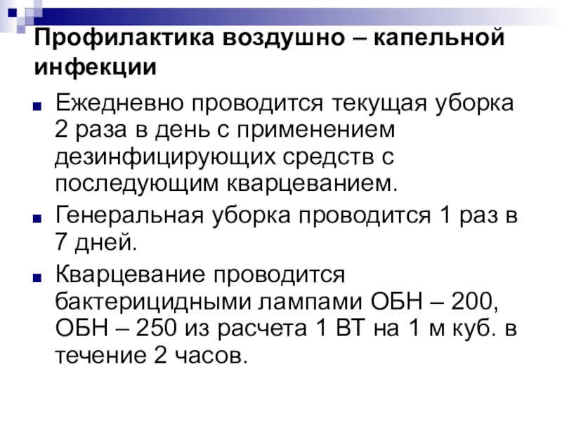 генеральная проводится 1 раз в неделю 9обработка всех поверхностей: пол, стены, потолок, лампы, аппараты).