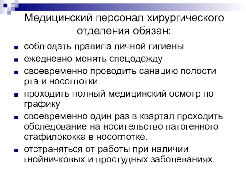 Слайд 13Медицинский персонал хирургического отделения обязан:
