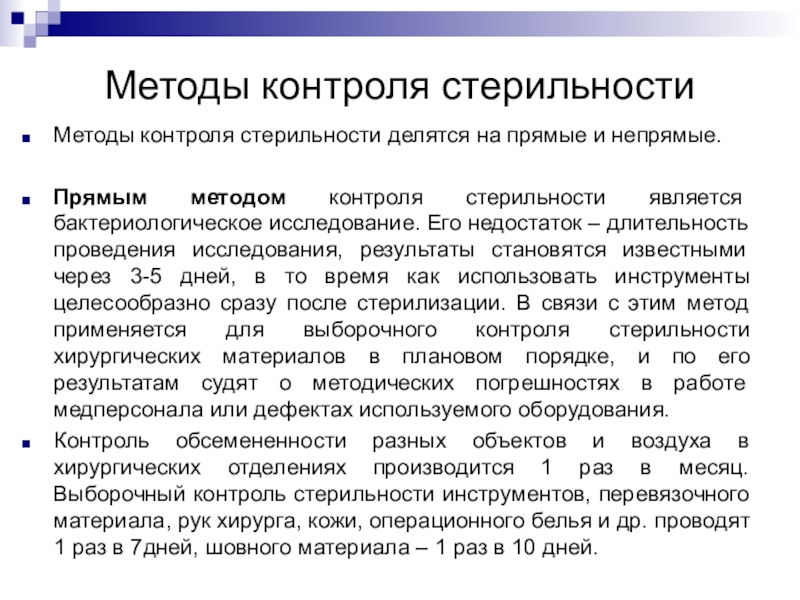 длительность проведения исследования, результаты становятся известными через 3-5 дней, в то время как использовать инструменты целесообразно сразу после стерилизации. В связи с этим метод применяется для выборочного контроля стерильности хирургических материалов в плановом порядке, и по его результатам судят о методических погрешностях в работе медперсонала или дефектах используемого оборудования.
