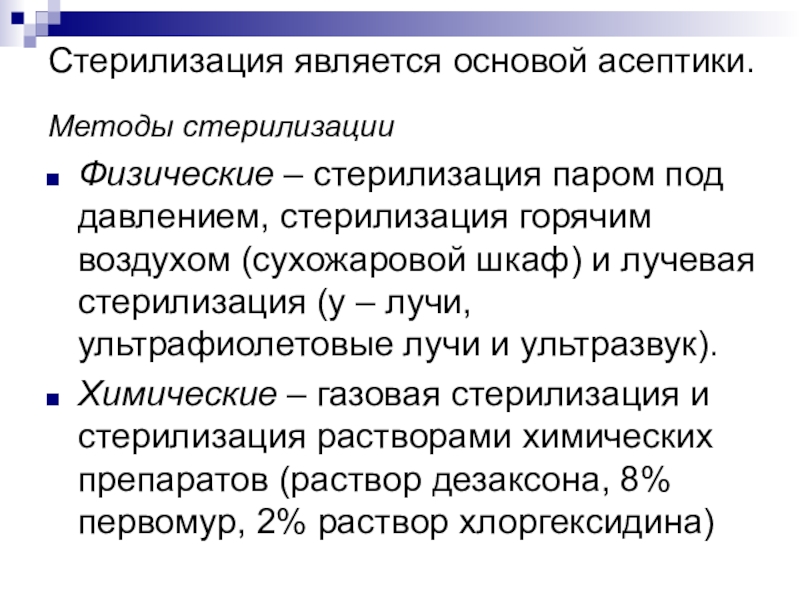 Химические – газовая стерилизация и стерилизация растворами химических препаратов (раствор дезаксона, 8% первомур, 2% раствор хлоргексидина)