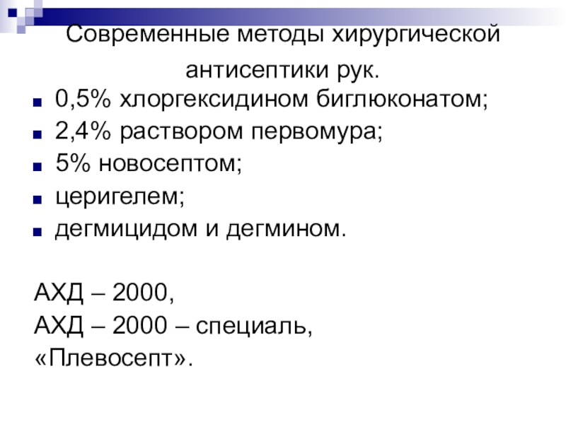 По ОСТу применяются современные антисептики: органические йодсодержащие препараты (1% йодонат, 1% йодопирон), хлоргексидин, АХД.