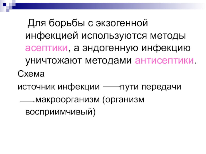 Слайд 6 Для борьбы с экзогенной инфекцией используются методы асептики, а эндогенную