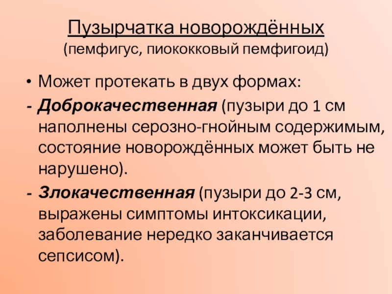 Злокачественная (пузыри до 2-3 см, выражены симптомы интоксикации, заболевание нередко заканчивается сепсисом).