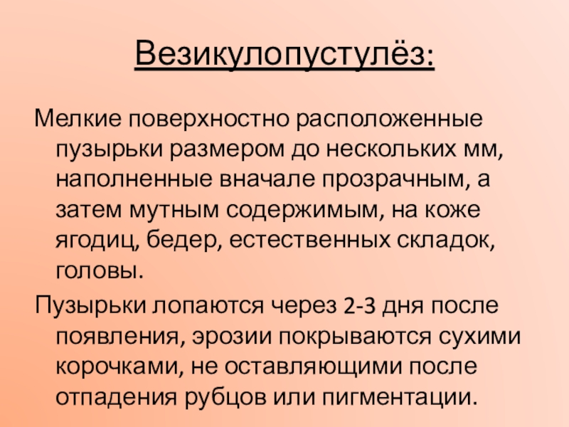 Мелкие поверхностно расположенные пузырьки размером до нескольких мм, наполненные вначале