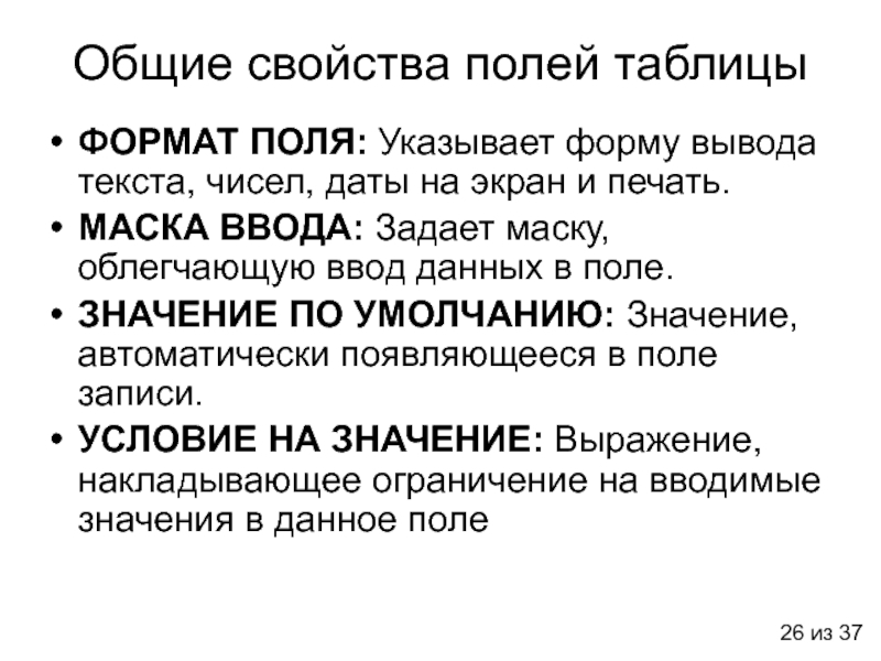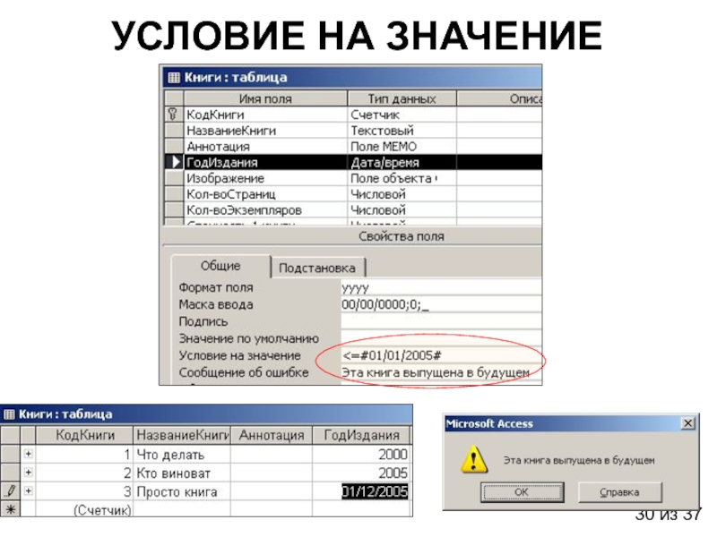 УСЛОВИЕ НА ЗНАЧЕНИЕ: Выражение, накладывающее ограничение на вводимые значения в данное поле