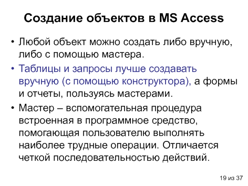 вручную (с помощью конструктора), а формы и отчеты, пользуясь мастерами.