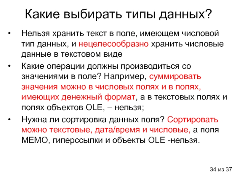 Какие операции должны производиться со значениями в поле? Например, суммировать значения можно в числовых полях и в полях, имеющих денежный формат, а в текстовых полях и полях объектов OLE, – нельзя;
