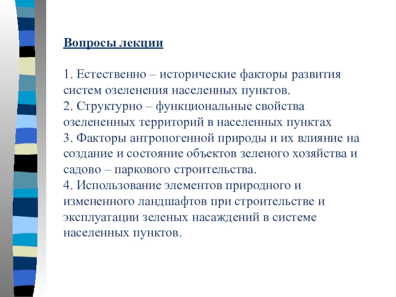 Слайд 2Вопросы лекции 1. Естественно – исторические факторы развития систем озеленения населенных пунктов. 2. Структурно