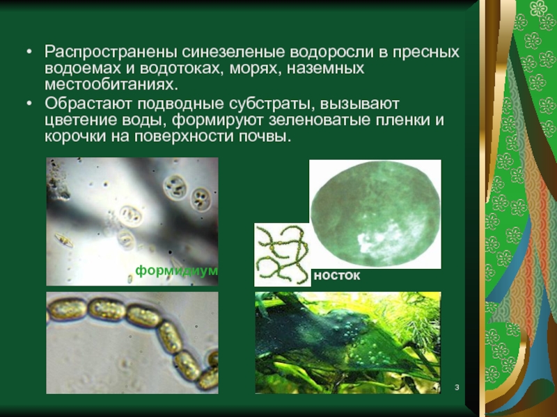 Слайд 3Распространены синезеленые водоросли в пресных водоемах и водотоках, морях, наземных