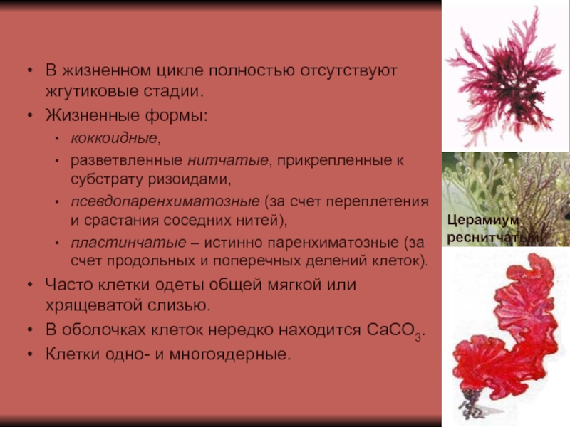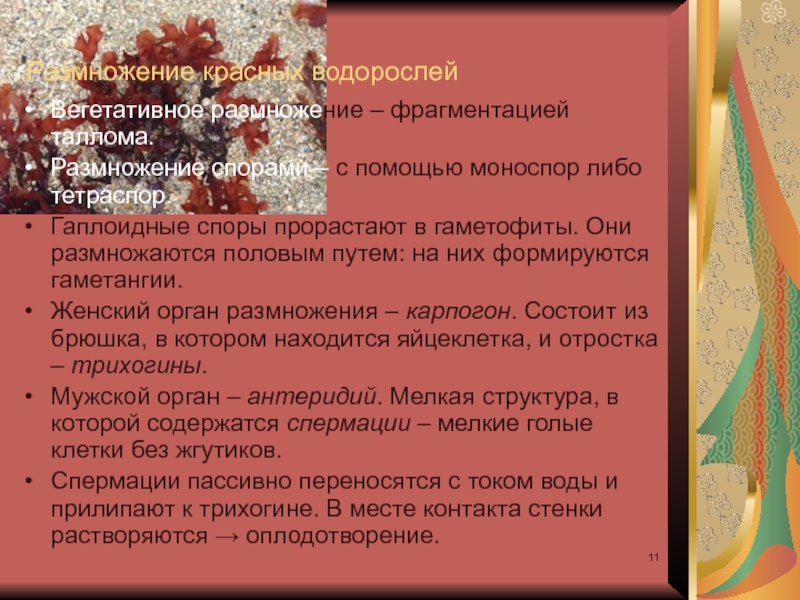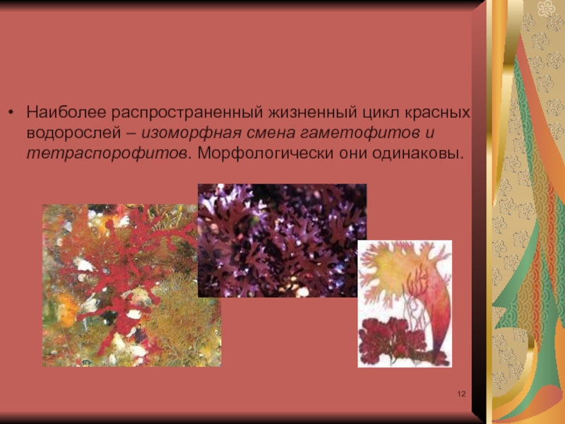 Слайд 12Наиболее распространенный жизненный цикл красных водорослей – изоморфная смена гаметофитов