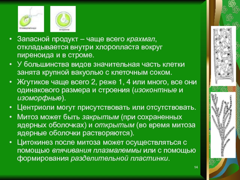 Слайд 14Запасной продукт – чаще всего крахмал, откладывается внутри хлоропласта вокруг