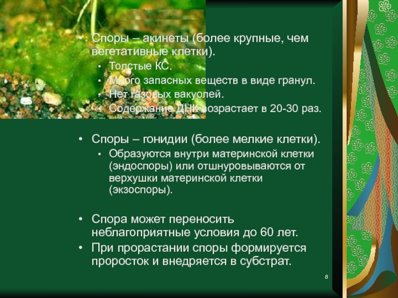 Слайд 8Споры – акинеты (более крупные, чем вегетативные клетки).