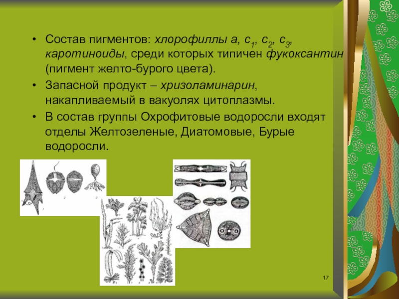 Слайд 17Состав пигментов: хлорофиллы a, c1, c2, c3, каротиноиды, среди которых