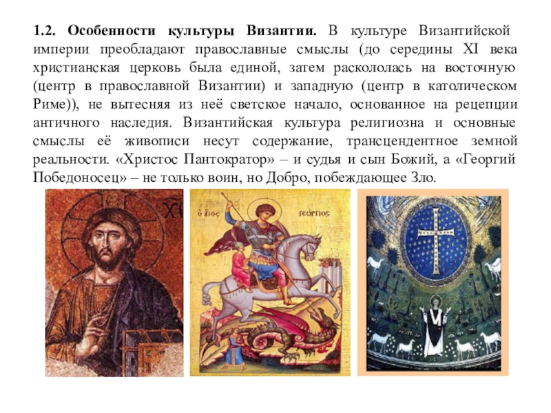 раскололась на восточную (центр в православной Византии) и западную (центр в католическом Риме)), не вытесняя из неё светское начало, основанное на рецепции античного наследия. Византийская культура религиозна и основные смыслы её живописи несут содержание, трансцендентное земной реальности. «Христос Пантократор» – и судья и сын Божий, а «Георгий Победоносец» – не только воин, но Добро, побеждающее Зло.