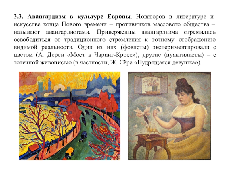 Приверженцы авангардизма стремились освободиться от традиционного стремления к точному отображению видимой реальности. Одни из них (фовисты) экспериментировали с цветом (А. Дерен «Мост в Чаринг-Кросс»), другие (пуантилисты) – с точечной живописью (в частности, Ж. Сёра «Пудрящаяся девушка»).