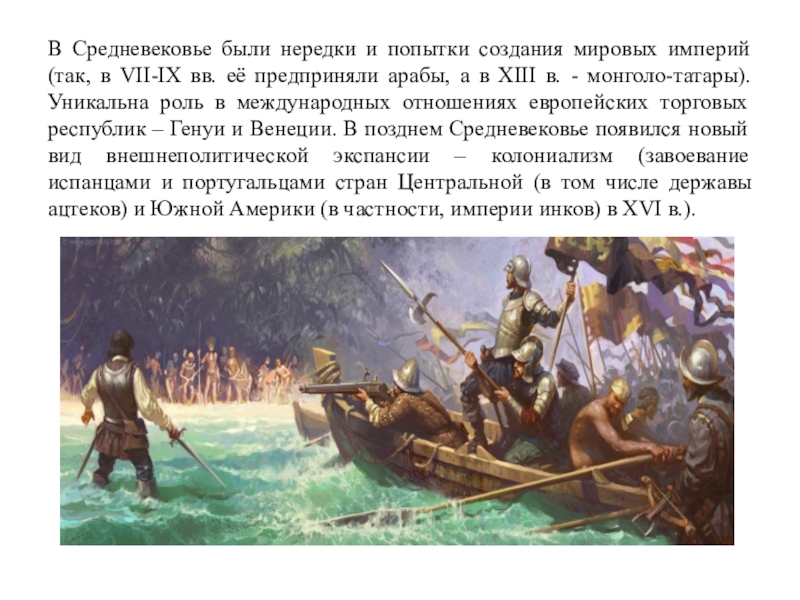 - монголо-татары). Уникальна роль в международных отношениях европейских торговых республик – Генуи и Венеции. В позднем Средневековье появился новый вид внешнеполитической экспансии – колониализм (завоевание испанцами и португальцами стран Центральной (в том числе державы ацтеков) и Южной Америки (в частности, империи инков) в XVI в.).