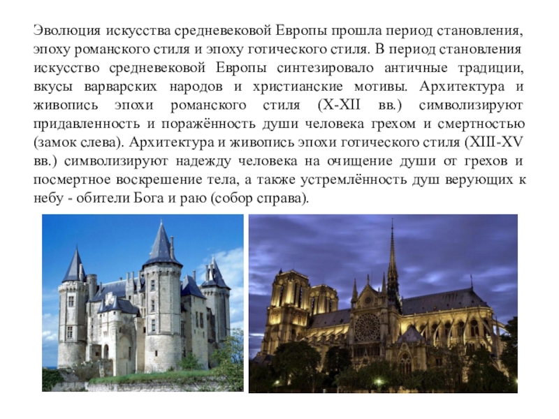 синтезировало античные традиции, вкусы варварских народов и христианские мотивы. Архитектура и живопись эпохи романского стиля (X-XII вв.) символизируют придавленность и поражённость души человека грехом и смертностью (замок слева). Архитектура и живопись эпохи готического стиля (XIII-XV вв.) символизируют надежду человека на очищение души от грехов и посмертное воскрешение тела, а также устремлённость душ верующих к небу - обители Бога и раю (собор справа).