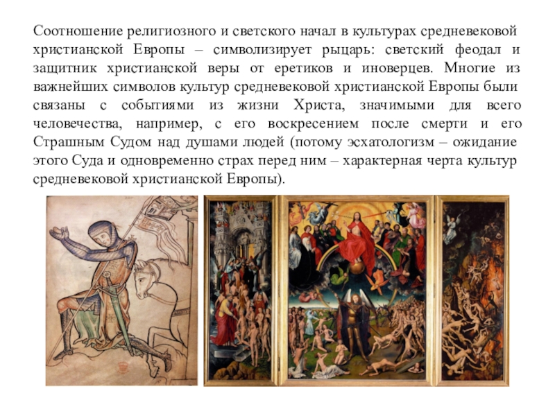 еретиков и иноверцев. Многие из важнейших символов культур средневековой христианской Европы были связаны с событиями из жизни Христа, значимыми для всего человечества, например, с его воскресением после смерти и его Страшным Судом над душами людей (потому эсхатологизм – ожидание этого Суда и одновременно страх перед ним – характерная черта культур средневековой христианской Европы).