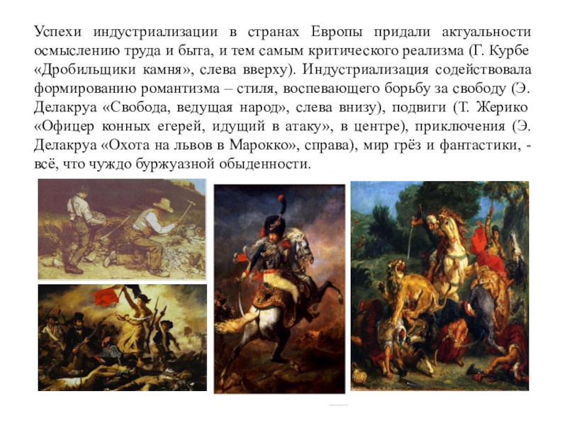 слева вверху). Индустриализация содействовала формированию романтизма – стиля, воспевающего борьбу за свободу (Э. Делакруа «Свобода, ведущая народ», слева внизу), подвиги (Т. Жерико «Офицер конных егерей, идущий в атаку», в центре), приключения (Э. Делакруа «Охота на львов в Марокко», справа), мир грёз и фантастики, - всё, что чуждо буржуазной обыденности.