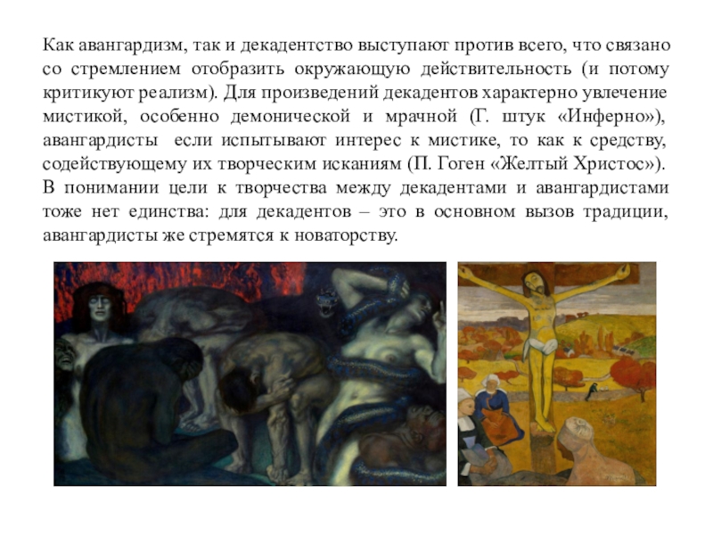 произведений декадентов характерно увлечение мистикой, особенно демонической и мрачной (Г. штук «Инферно»), авангардисты если испытывают интерес к мистике, то как к средству, содействующему их творческим исканиям (П. Гоген «Желтый Христос»). В понимании цели к творчества между декадентами и авангардистами тоже нет единства: для декадентов – это в основном вызов традиции, авангардисты же стремятся к новаторству.