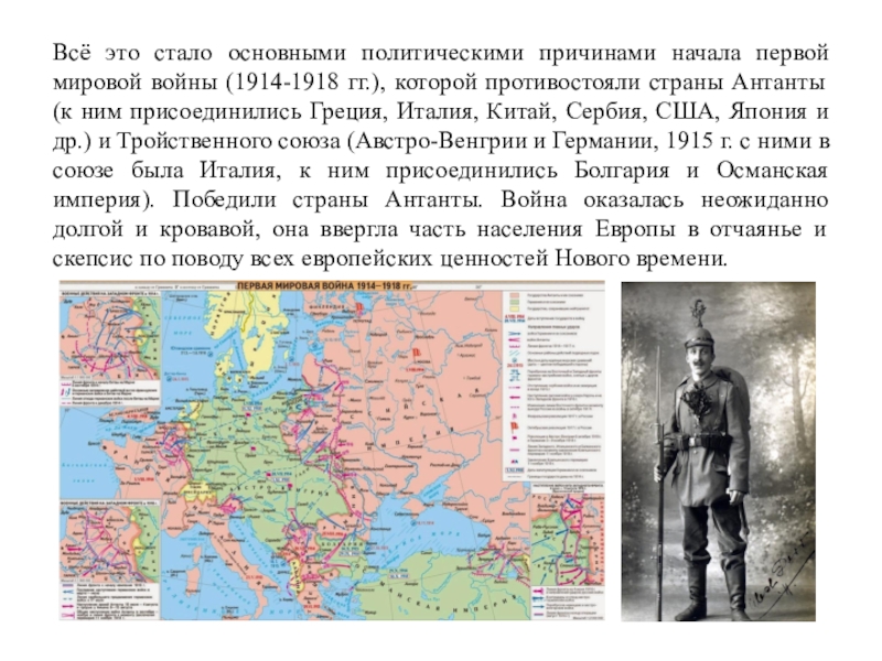 Италия, Китай, Сербия, США, Япония и др.) и Тройственного союза (Австро-Венгрии и Германии, 1915 г. с ними в союзе была Италия, к ним присоединились Болгария и Османская империя). Победили страны Антанты. Война оказалась неожиданно долгой и кровавой, она ввергла часть населения Европы в отчаянье и скепсис по поводу всех европейских ценностей Нового времени.