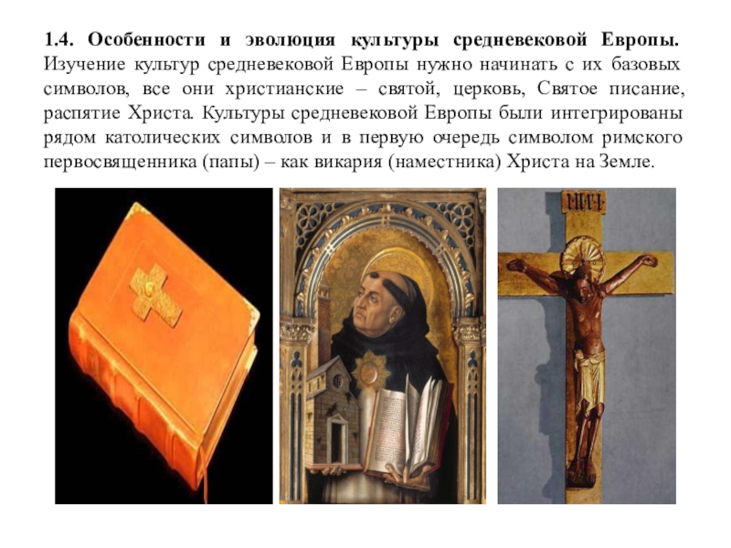 – святой, церковь, Святое писание, распятие Христа. Культуры средневековой Европы были интегрированы рядом католических символов и в первую очередь символом римского первосвященника (папы) – как викария (наместника) Христа на Земле.