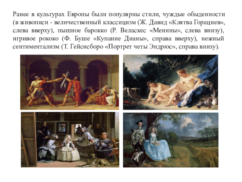 пышное барокко (Р. Веласкес «Менины», слева внизу), игривое рококо (Ф. Буше «Купание Дианы», справа вверху), нежный сентиментализм (Т. Гейснсборо «Портрет четы Эндрюс», справа внизу).