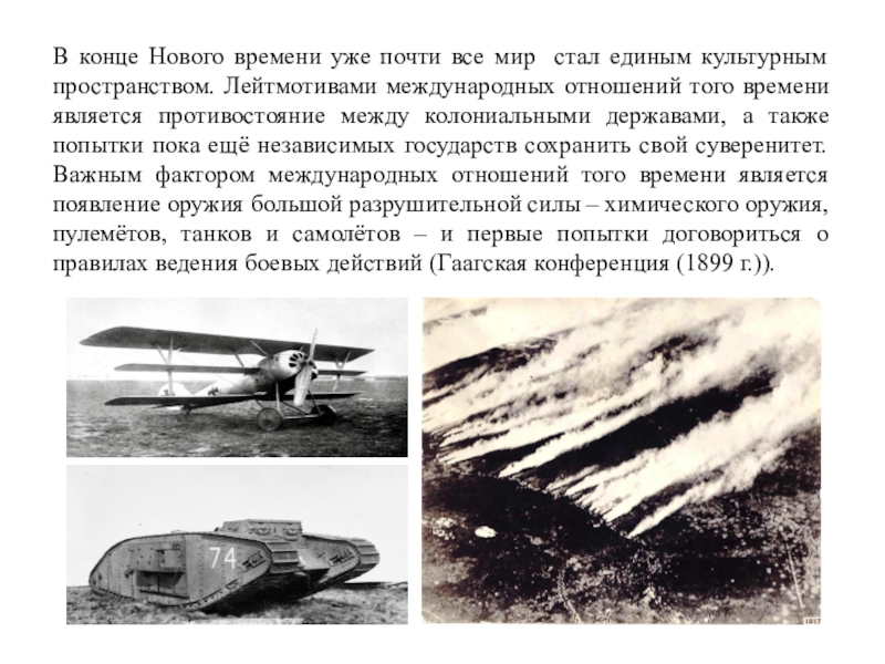 колониальными державами, а также попытки пока ещё независимых государств сохранить свой суверенитет. Важным фактором международных отношений того времени является появление оружия большой разрушительной силы – химического оружия, пулемётов, танков и самолётов – и первые попытки договориться о правилах ведения боевых действий (Гаагская конференция (1899 г.)).