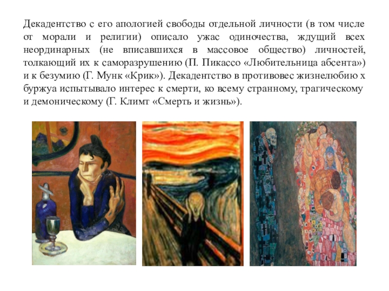 (не вписавшихся в массовое общество) личностей, толкающий их к саморазрушению (П. Пикассо «Любительница абсента») и к безумию (Г. Мунк «Крик»). Декадентство в противовес жизнелюбию х буржуа испытывало интерес к смерти, ко всему странному, трагическому и демоническому (Г. Климт «Смерть и жизнь»).