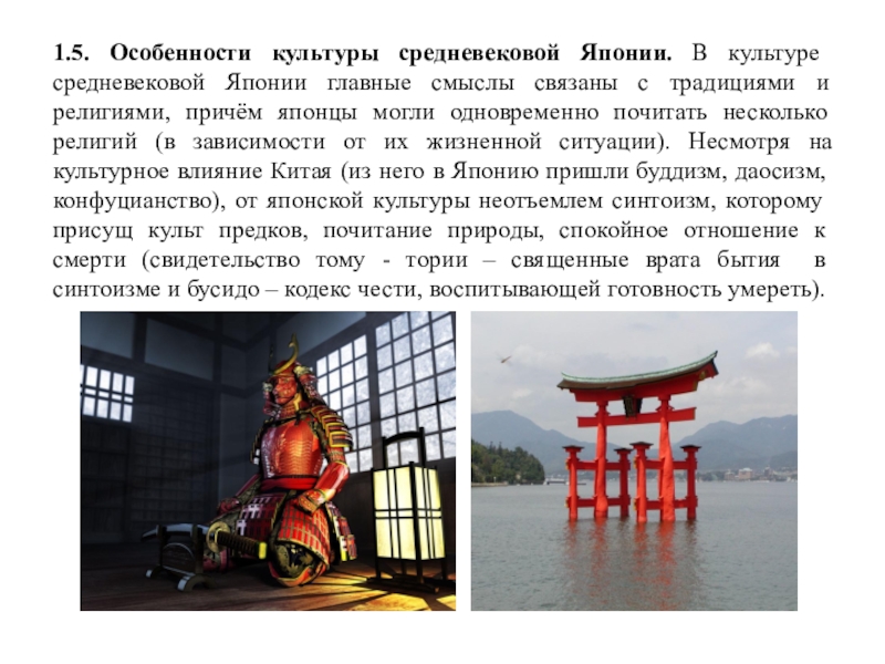 Слайд 111.5. Особенности культуры средневековой Японии. В культуре средневековой Японии главные