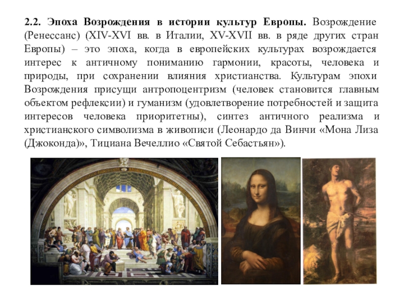 – это эпоха, когда в европейских культурах возрождается интерес к античному пониманию гармонии, красоты, человека и природы, при сохранении влияния христианства. Культурам эпохи Возрождения присущи антропоцентризм (человек становится главным объектом рефлексии) и гуманизм (удовлетворение потребностей и защита интересов человека приоритетны), синтез античного реализма и христианского символизма в живописи (Леонардо да Винчи «Мона Лиза (Джоконда)», Тициана Вечеллио «Святой Себастьян»).