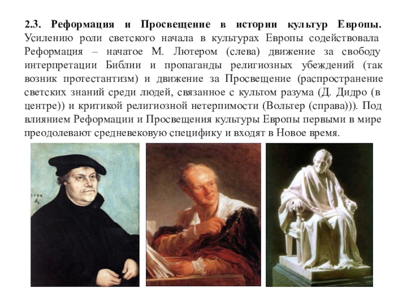 Лютером (слева) движение за свободу интерпретации Библии и пропаганды религиозных убеждений (так возник протестантизм) и движение за Просвещение (распространение светских знаний среди людей, связанное с культом разума (Д. Дидро (в центре)) и критикой религиозной нетерпимости (Вольтер (справа))). Под влиянием Реформации и Просвещения культуры Европы первыми в мире преодолевают средневековую специфику и входят в Новое время.