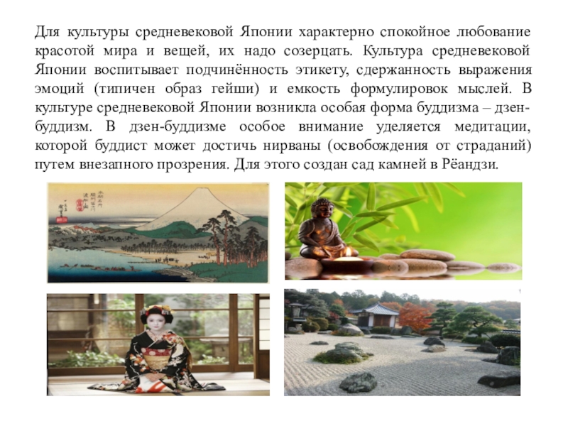 сдержанность выражения эмоций (типичен образ гейши) и емкость формулировок мыслей. В культуре средневековой Японии возникла особая форма буддизма – дзен-буддизм. В дзен-буддизме особое внимание уделяется медитации, которой буддист может достичь нирваны (освобождения от страданий) путем внезапного прозрения. Для этого создан сад камней в Рёандзи.