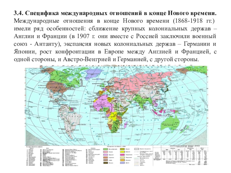 крупных колониальных держав – Англии и Франции (в 1907 г. они вместе с Россией заключили военный союз - Антанту), экспансия новых колониальных держав – Германии и Японии, рост конфронтации в Европе между Англией и Францией, с одной стороны, и Австро-Венгрией и Германией, с другой стороны.