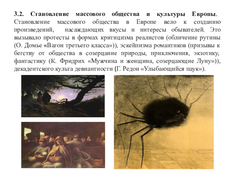 обывателей. Это вызывало протесты в формах критицизма реалистов (обличение рутины (О. Домье «Вагон третьего класса»)), эскейпизма романтиков (призывы к бегству от общества в созерцание природы, приключения, экзотику, фантастику (К. Фридрих «Мужчина и женщина, созерцающие Луну»)), декадентского культа девиантности (Г. Редон «Улыбающийся паук»).