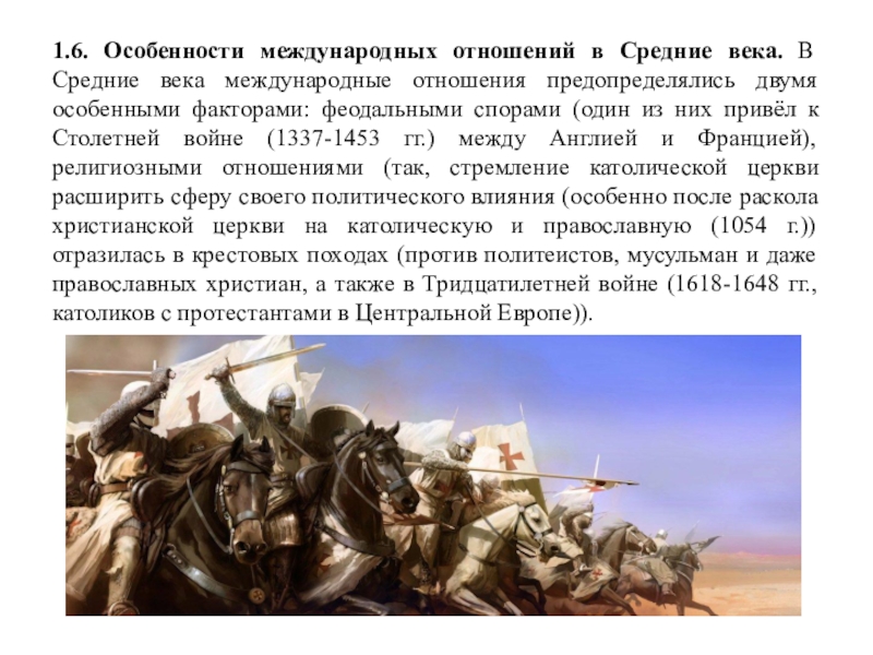 них привёл к Столетней войне (1337-1453 гг.) между Англией и Францией), религиозными отношениями (так, стремление католической церкви расширить сферу своего политического влияния (особенно после раскола христианской церкви на католическую и православную (1054 г.)) отразилась в крестовых походах (против политеистов, мусульман и даже православных христиан, а также в Тридцатилетней войне (1618-1648 гг., католиков с протестантами в Центральной Европе)).