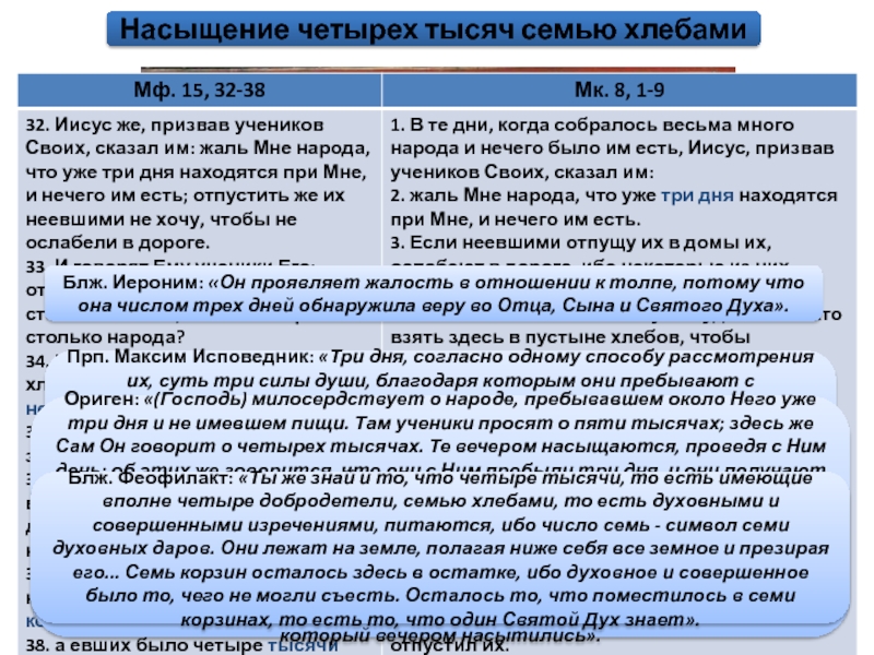 Ориген: «(Господь) милосердствует о народе, пребывавшем около Него уже три дня и не имевшем пищи. Там ученики просят о пяти тысячах; здесь же Сам Он говорит о четырех тысячах. Те вечером насыщаются, проведя с Ним день; об этих же говорится, что они с Ним пробыли три дня, и они получают хлебы, чтобы не ослабеть на пути. Там говорят ученики о пяти хлебах и двух рыбах, которые имелись у них, хотя Господь об этом не спрашивал; здесь же отвечают на вопрос, что у них было семь хлебов и немного рыбок. Там Он повелевает народу возлечь на траве, здесь же не велит, а возвещает народу о том, чтобы возлечь на земле. Эти на горе насыщаются, а те в пустынном месте. Эти три дня пребывали с Иисусом, а те один день, в который вечером насытились».