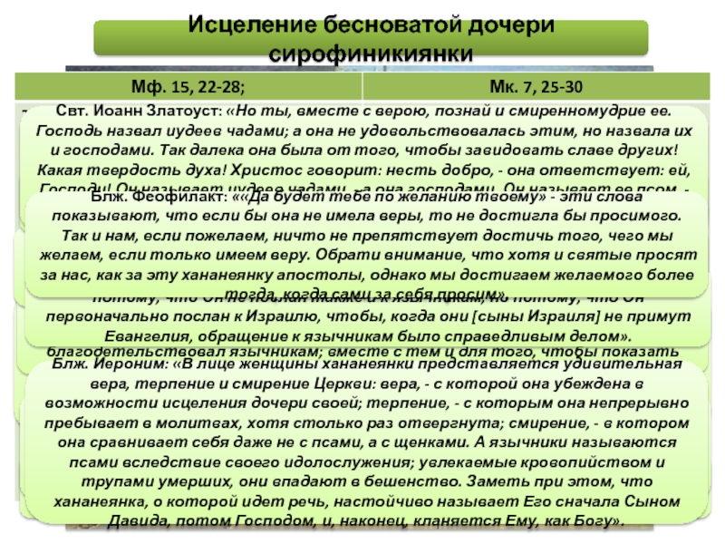 Свт. Иоанн Златоуст: «чем более усиливает она свою просьбу, тем и Он решительнее отказывает. Он уже не овцами называет иудеев, но чадами, а ее псом. Как же поступает жена? Она в самых Его словах находит себе защиту. Если я пес, говорит она, то значит не чужая. Жена любомудрствует, показывает великое терпение и веру, не смотря на свое уничижение; а иудеи, получая исцеления и почести, воздают противным».