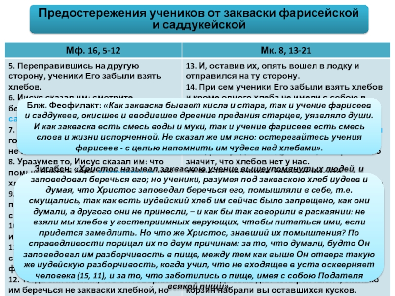 Зигабен: «Христос называл закваскою учение вышеупомянутых людей, и заповедовал беречься его; но ученики, разумея под закваскою хлеб иудеев и думая, что Христос заповедал беречься его, помышляли в себе, т.е. смущались, так как есть иудейский хлеб им сейчас было запрещено, как они думали, а другого они не принесли, – и как бы так говорили в раскаянии: не взяли мы хлебов у гостеприимных верующих, чтобы питаться ими, если придется замедлить. Но что же Христос, знавший их помышления? По справедливости порицал их по двум причинам: за то, что думали, будто Он заповедовал им разборчивость в пище, между тем как выше Он отверг такую же иудейскую разборчивость, когда учил, что не входящее в уста оскверняет человека (15, 11), и за то, что заботились о пище, имея с собою Подателя всякой пищи».