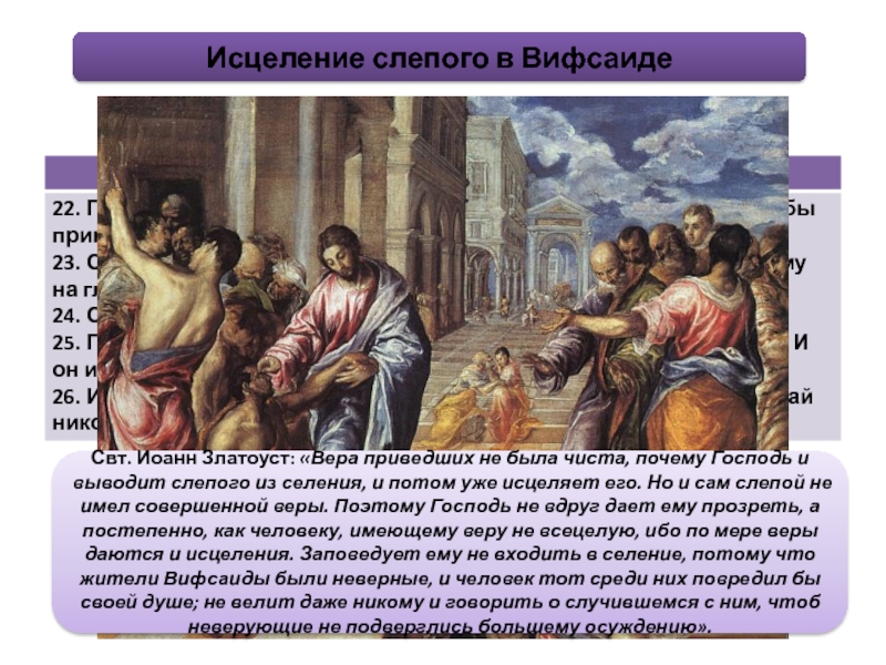 Зигабен: «Оставите их…, как неисцелимых. Поэтому и не врачует соблазна их, зная, что ничто не принесет им пользы. Называет их слепыми, потому что поток страстей ослепил их душевный глаз, и они не могут взирать на свет истины».