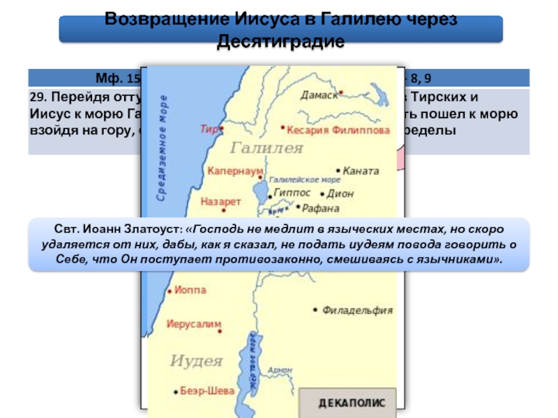 Зигабен: «Каким образом, заповедав ученикам не ходить на путь к язычникам (Мф. 10, 5), Сам пошел? Пошел, но не с тем, чтобы проповедовать, а чтобы немного отдохнуть. Поэтому, придя, как говорит Марк (7, 24), Он вошел в дом и не хотел, чтобы кто узнал: но не мог утаиться».