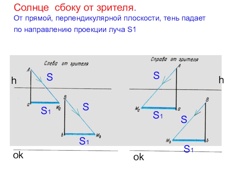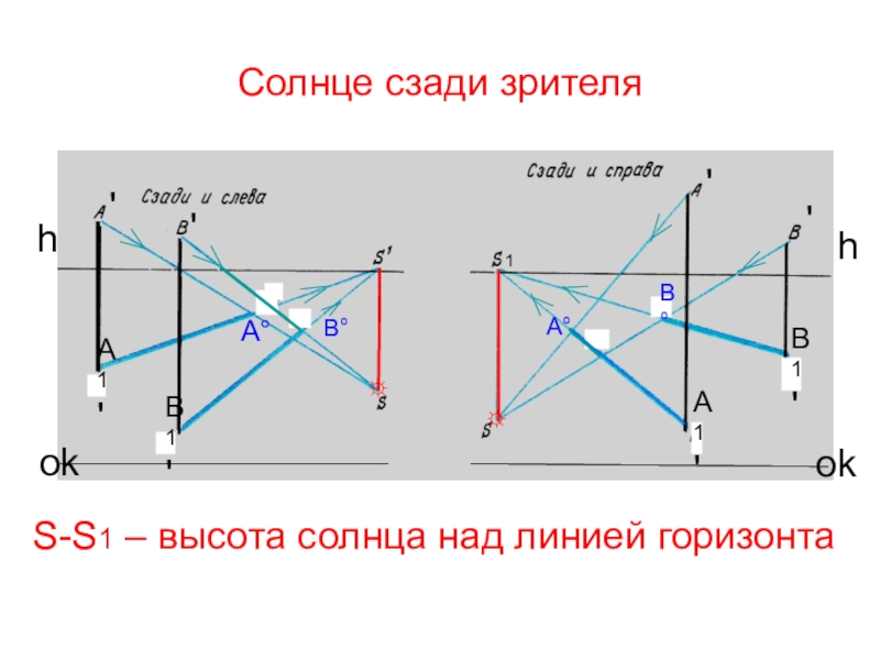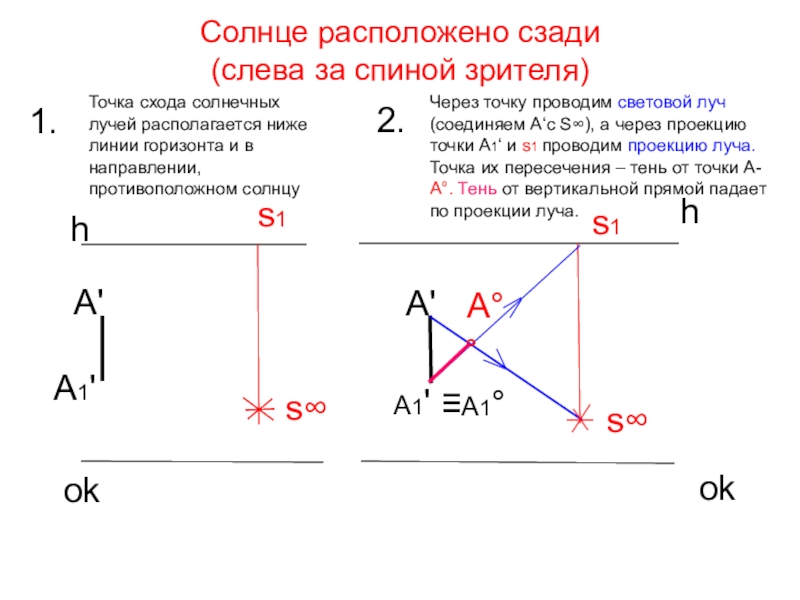 Точка их пересечения – тень от точки А- А°. Тень от вертикальной прямой падает по проекции луча.