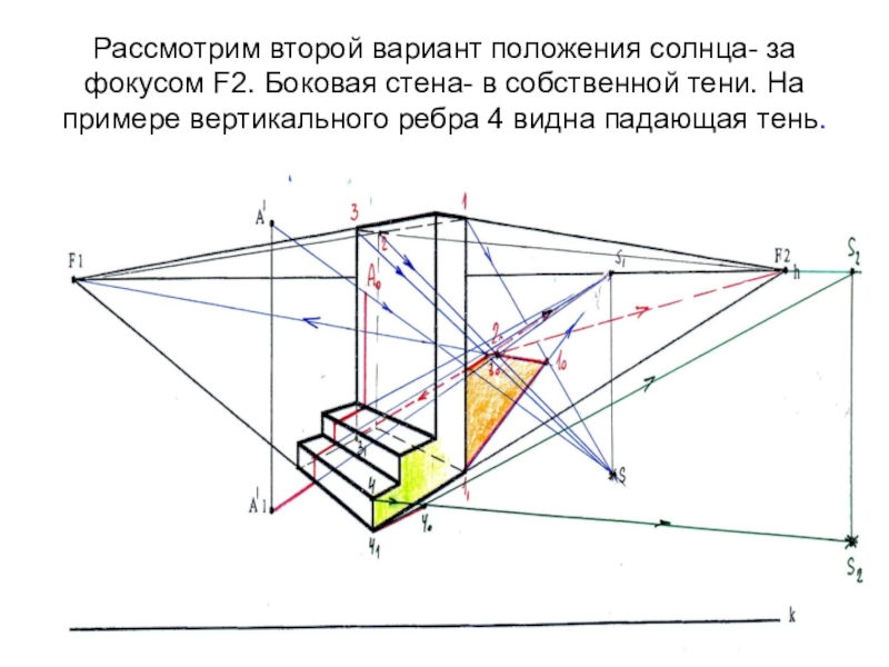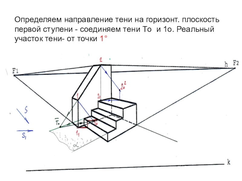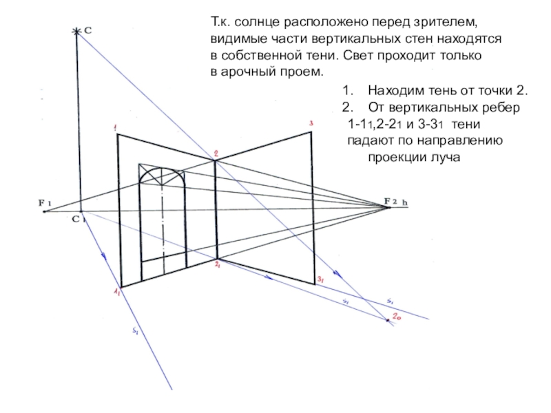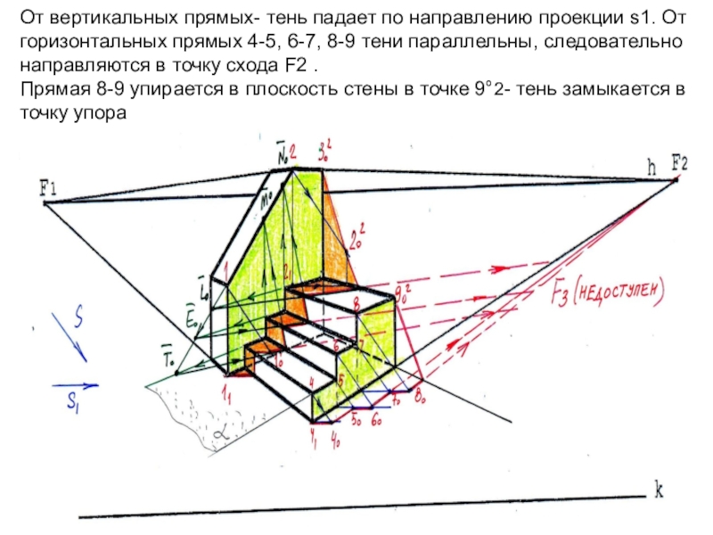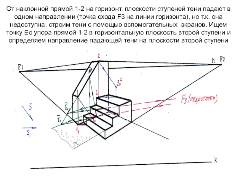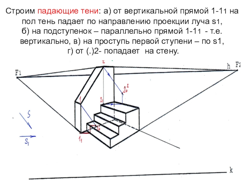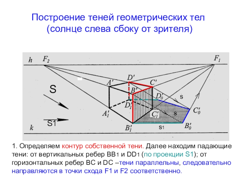 ВВ1 и DD1 (по проекции S1); от горизонтальных ребер ВС и DC –тени параллельны, следовательно направляются в точки схода F1 и F2 соответственно.