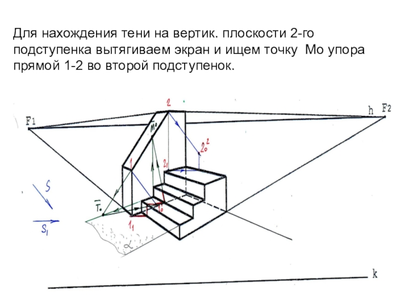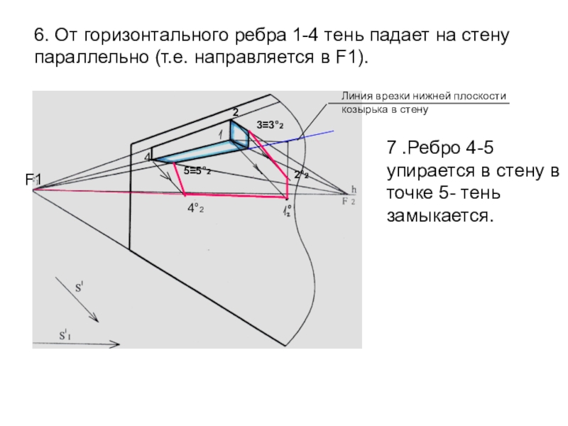 Слайд 424. От вертикального ребра 1-2 тень падает на стену параллельно