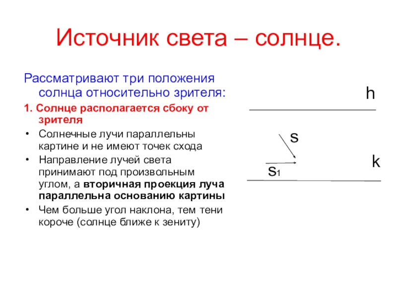 Направление лучей света принимают под произвольным углом, а вторичная проекция луча параллельна основанию картины