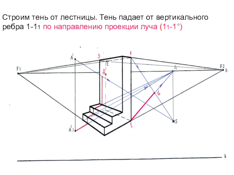 Слайд 14Строим тень от лестницы. Тень падает от вертикального ребра 1-11