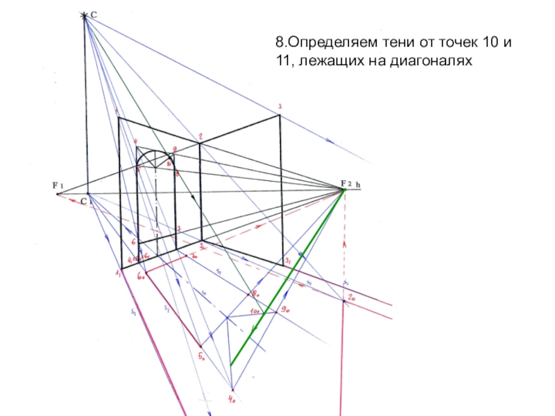 Слайд 508.Определяем тени от точек 10 и 11, лежащих на диагоналях