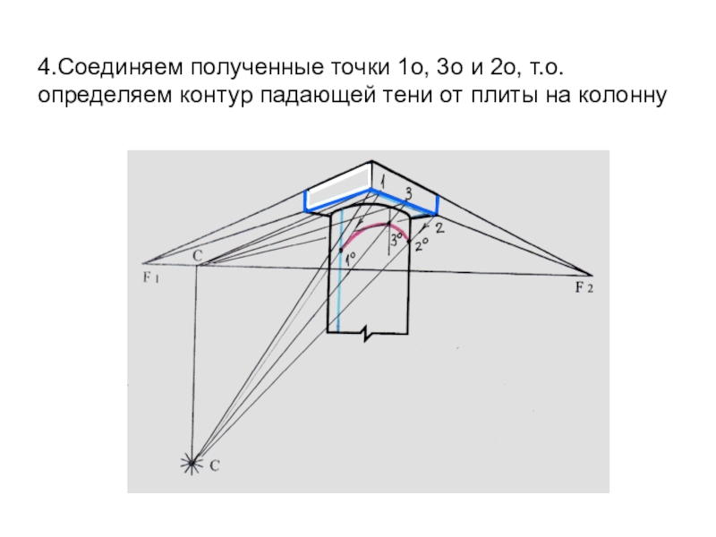 Строим тень 1°и 2°, для чего (.)1 и (.)2 соединяем лучом с (.)С- точкой схода солнечных лучей
